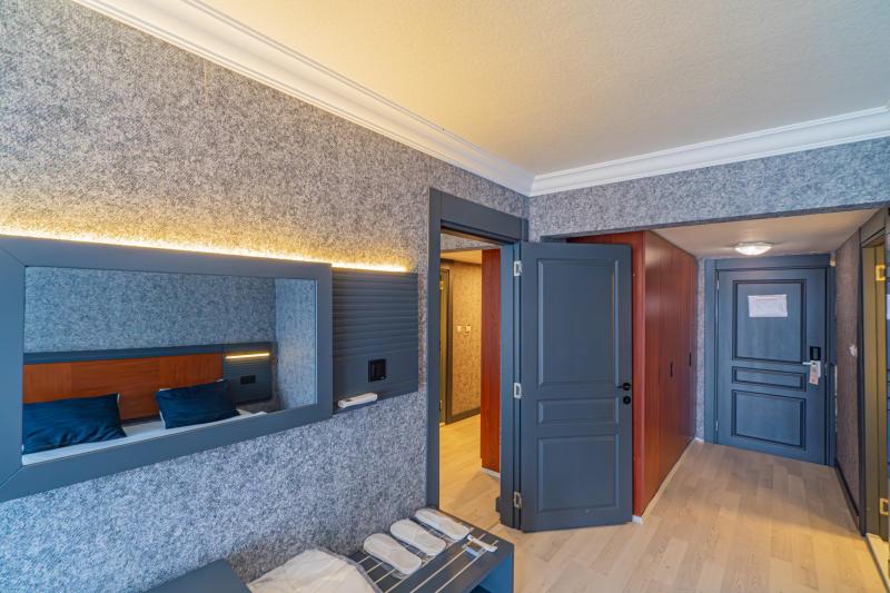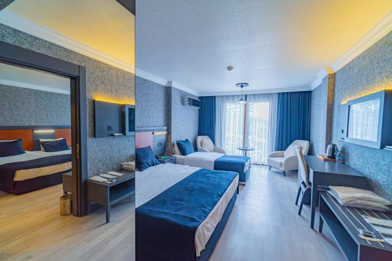 40 m2 genişliğinde olan odalarımız da 1 çift kişilik yatak, dört adet tek kişilik yatak bulunmaktadır. Max 5 yetişkin ve 0-11,99 yaş 1 çocuk konaklama için uygundur. İki odadan ibarettir.